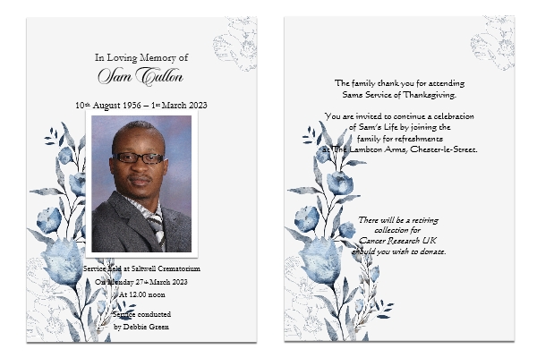 Not only do Funeral service booklets such as this guide the mourners, but they also provide a lasting after funeral keepsake which many people find comforting. After a funeral the funeral service booklet can also be sent to people who were unable to attend the ceremony. After you have purchased please email your details and images and we will email sample pages within 24 hours after receiving your details …..for you to proof read before sending to print. We usually can print within a 1 – 2 days after receiving the details and then posting out.