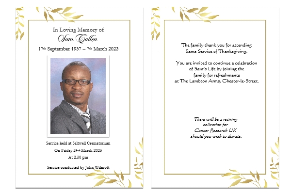 Not only do Funeral service booklets such as this guide the mourners, but they also provide a lasting after funeral keepsake which many people find comforting. After a funeral the funeral service booklet can also be sent to people who were unable to attend the ceremony. After you have purchased please email your details and images and we will email sample pages within 24 hours after receiving your details …..for you to proof read before sending to print. We usually can print within a 1 – 2 days after receiving the details and then posting out.