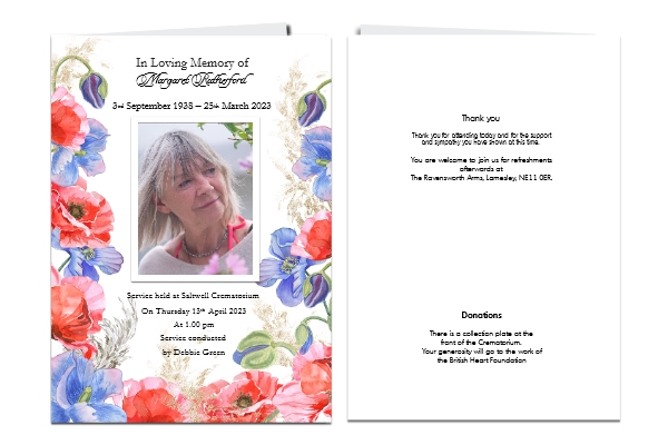 Funeral Order of Service will be folded A4 card with either four or eight pages. Size A5 148 mm x 210 mm when folded. It is usual to give printed funeral order of service details to the attendees. Often in the form of a simple four or eight page booklet complete with one or more carefully chosen pictures. The Funeral order of service is normally placed on seats, in church pews or given to mourners as they arrive for the funeral. A Funeral Order of Service is a very personal for your loved one and we work with to create something very personal to them.
