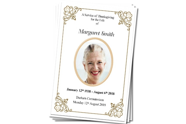 Funeral Order of Service will be folded A4 card with either four or eight pages. Size A5 148 mm x 210 mm when folded. It is usual to give printed funeral order of service details to the attendees. Often in the form of a simple four or eight page booklet complete with one or more carefully chosen pictures. The Funeral order of service is normally placed on seats, in church pews or given to mourners as they arrive for the funeral. A Funeral Order of Service is a very personal for your loved one and we work with to create something very personal to them.