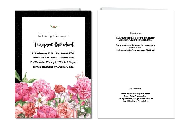 Funeral Order of Service will be folded A4 card with either four or eight pages. Size A5 148 mm x 210 mm when folded. It is usual to give printed funeral order of service details to the attendees. Often in the form of a simple four or eight page booklet complete with one or more carefully chosen pictures. The Funeral order of service is normally placed on seats, in church pews or given to mourners as they arrive for the funeral. A Funeral Order of Service is a very personal for your loved one and we work with to create something very personal to them.