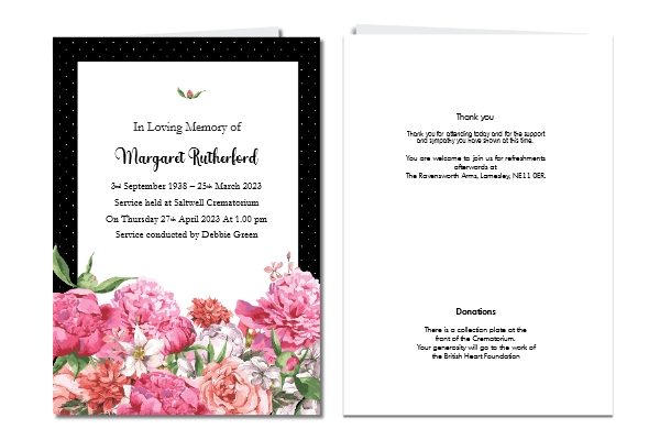 Funeral Order of Service will be folded A4 card with either four or eight pages. Size A5 148 mm x 210 mm when folded. It is usual to give printed funeral order of service details to the attendees. Often in the form of a simple four or eight page booklet complete with one or more carefully chosen pictures. The Funeral order of service is normally placed on seats, in church pews or given to mourners as they arrive for the funeral. A Funeral Order of Service is a very personal for your loved one and we work with to create something very personal to them.