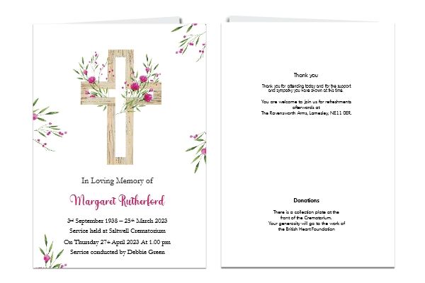 Funeral Order of Service will be folded A4 card with either four or eight pages. Size A5 148 mm x 210 mm when folded. It is usual to give printed funeral order of service details to the attendees. Often in the form of a simple four or eight page booklet complete with one or more carefully chosen pictures. The Funeral order of service is normally placed on seats, in church pews or given to mourners as they arrive for the funeral. A Funeral Order of Service is a very personal for your loved one and we work with to create something very personal to them.