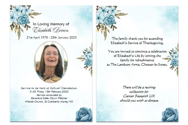 Funeral Order of Service will be folded A4 card with either four or eight pages. Size A5 148 mm x 210 mm when folded. It is usual to give printed funeral order of service details to the attendees. Often in the form of a simple four or eight page booklet complete with one or more carefully chosen pictures. The Funeral order of service is normally placed on seats, in church pews or given to mourners as they arrive for the funeral. A Funeral Order of Service is a very personal for your loved one and we work with to create something very personal to them.