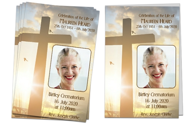 Funeral Order of Service will be folded A4 card with either four or eight pages. Size A5 148 mm x 210 mm when folded. It is usual to give printed funeral order of service details to the attendees. Often in the form of a simple four or eight page booklet complete with one or more carefully chosen pictures. The Funeral order of service is normally placed on seats, in church pews or given to mourners as they arrive for the funeral. A Funeral Order of Service is a very personal for your loved one and we work with to create something very personal to them.